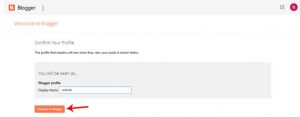 3. गूगल अकाउंट से लॉगिन हो जाने के बाद अब आप Display Name के आगे वाले बॉक्स में अपना नाम टाइप करें और Continue to Blogger पर क्लिक करें.