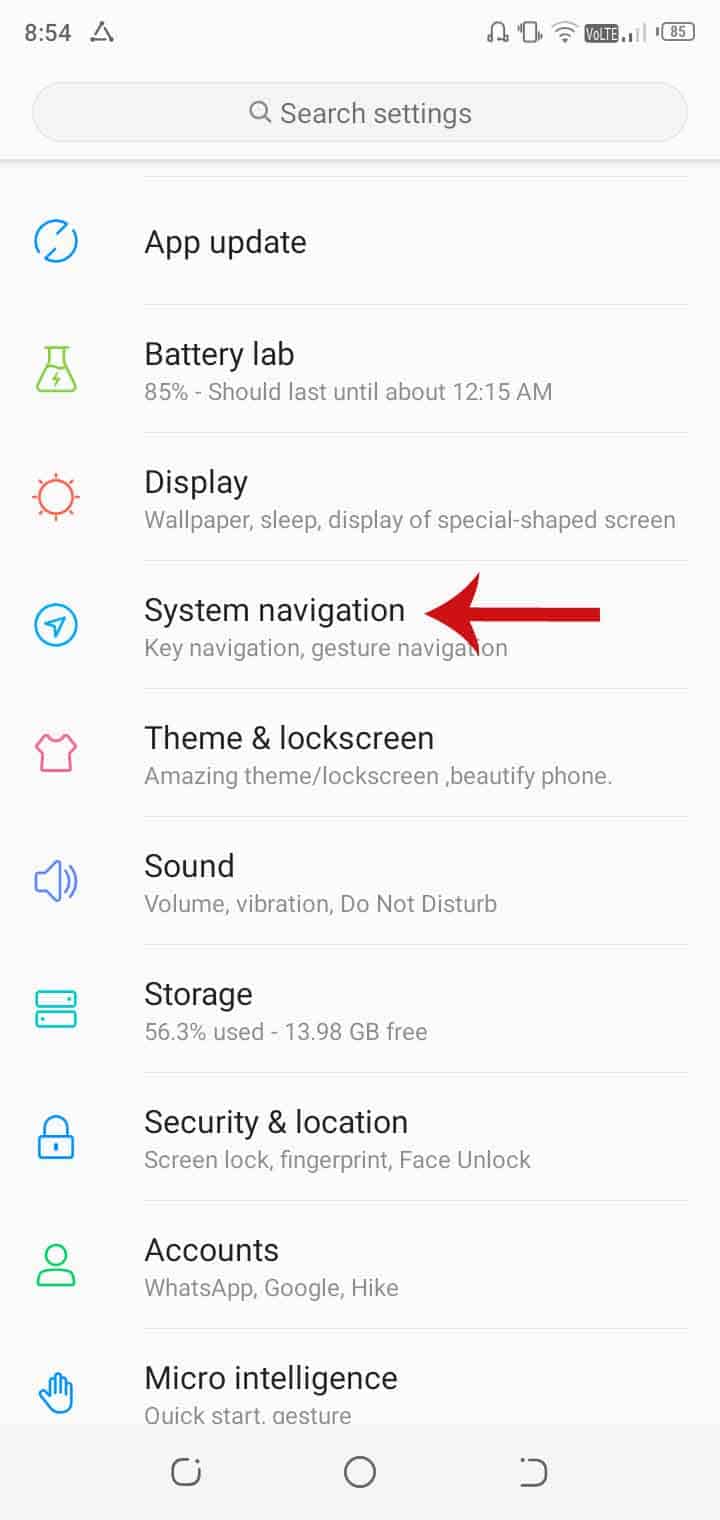 4. mobile Settings ओपन हो जाने के बाद अब आप नीचे इस scroll करें और System Navigation पर क्लिक करें ( हो सकता है कि यह ऑप्शन आपके mobile में और कुछ नाम से हो जैसे कि Key Navigation, Gesture Navigation).